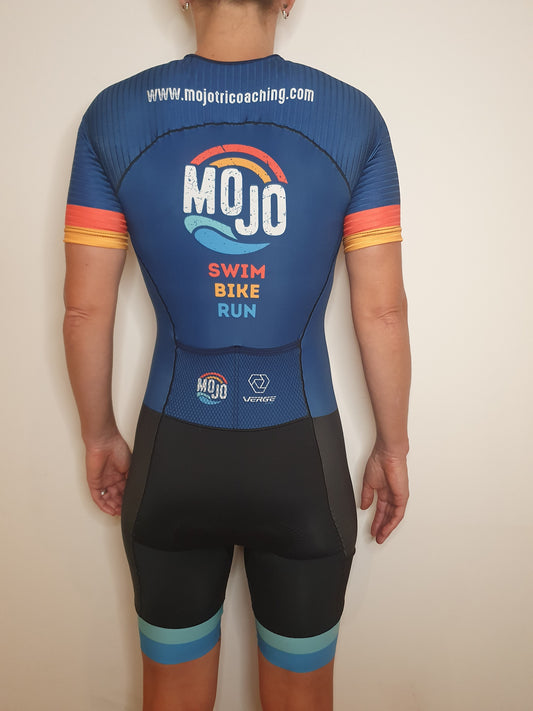The Mojo Tri Suit is an essential gear for racing, offering a perfect blend of performance, comfort, and functionality. Designed for triathletes, it provides aerodynamic efficiency, reducing drag to enhance speed during cycling and running. Its quick-drying, breathable fabric keeps athletes cool and comfortable across swim, bike, and run transitions.